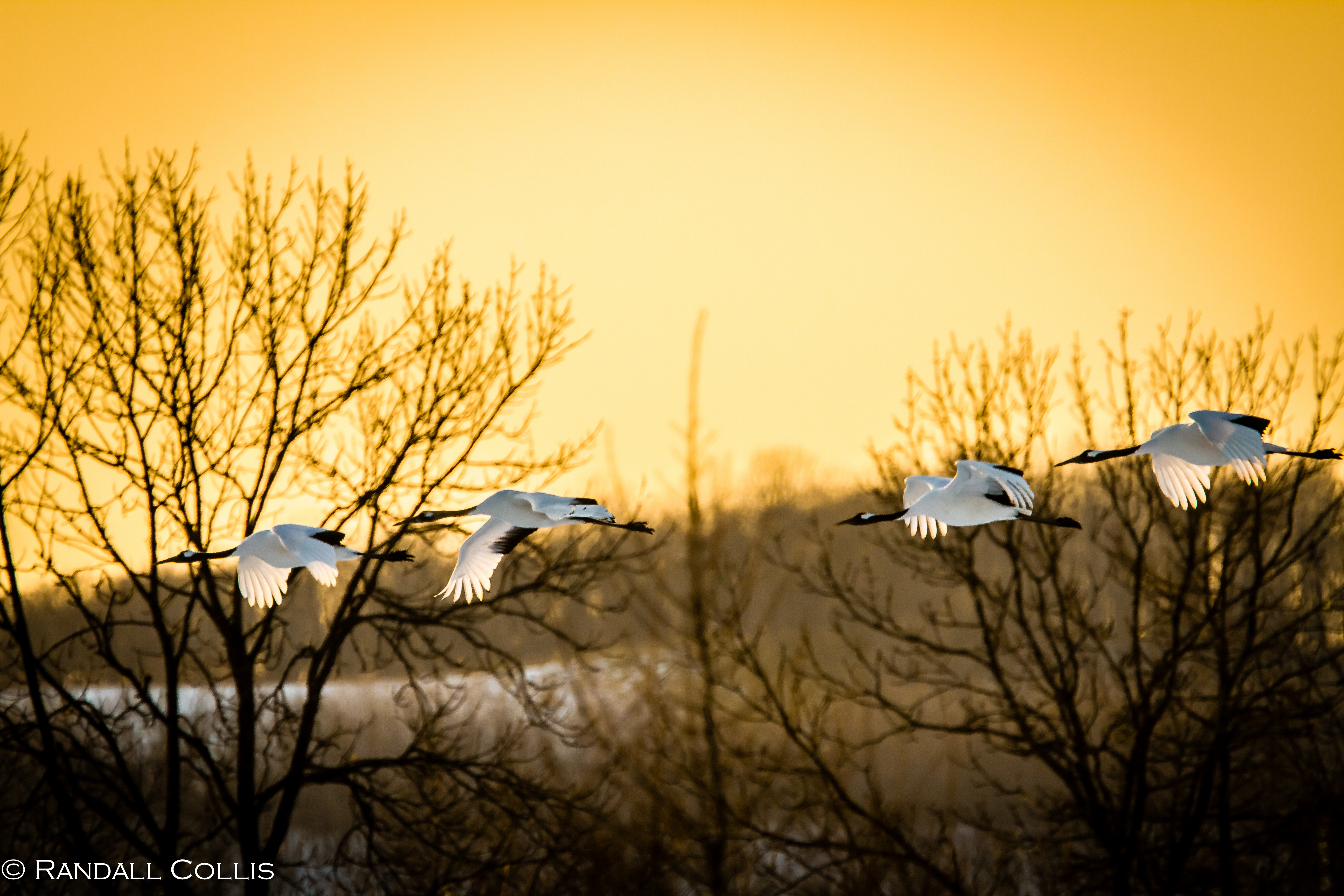 Red-Crested Cranes in Evening Flight - Hokkaido, Japan